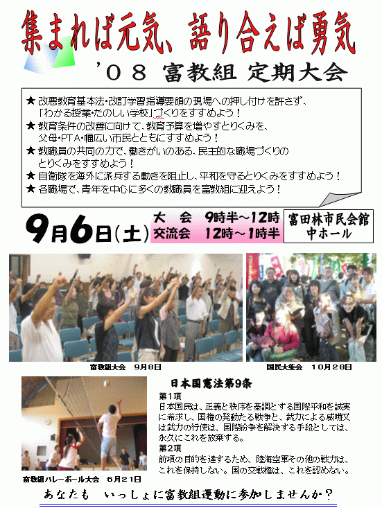 9月6日(土)9:30より富田林市民会館(レインボーホール)にて、富田林市教職員組合2008年度定期大会が行われました。