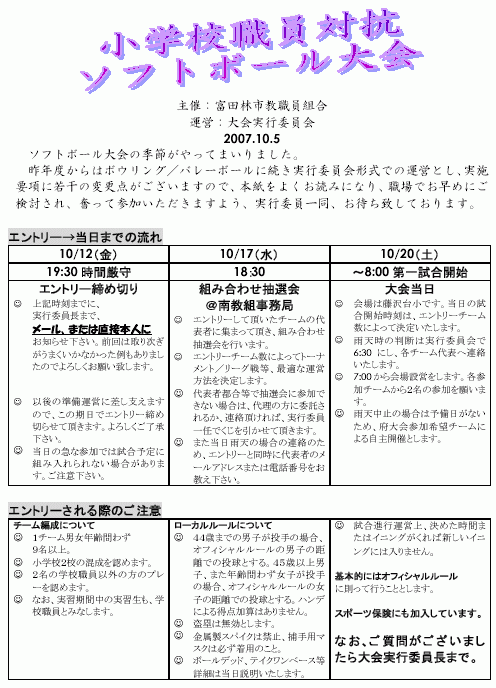 10/20(土)に行われる「ソフトボール大会のお知らせ」と、