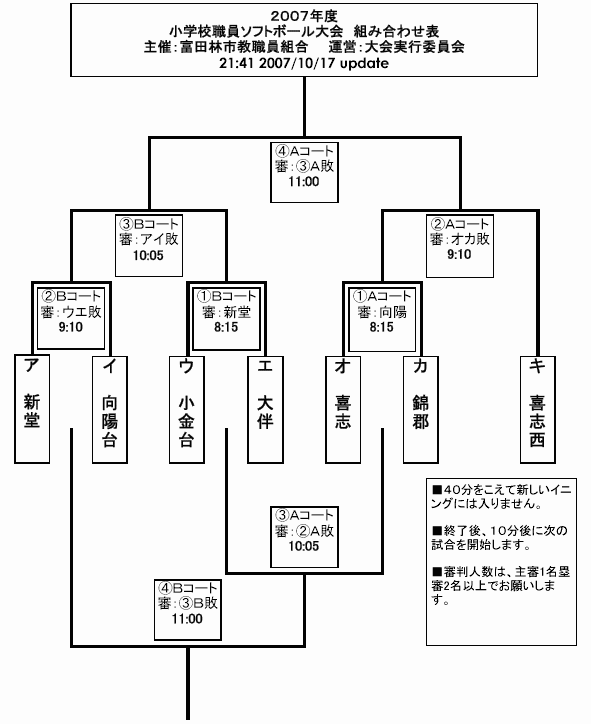 向陽台は連絡いただいて実行委員会一任で、その他のチームは代表者の方に集まっていただき、まずは7チームでどのような試合形式にするのかを話し合いました。せっかく朝早く集まっていただくのだから、試合数を多くする方向で考えました。結果、3チームと4チームによるリーグ戦を行った上で決勝戦を、という案もありましたが、時間の関係上、やはりトーナメント戦が妥当という結論になりました。試合数は敗者同士の試合を組む、ということでカバーです。